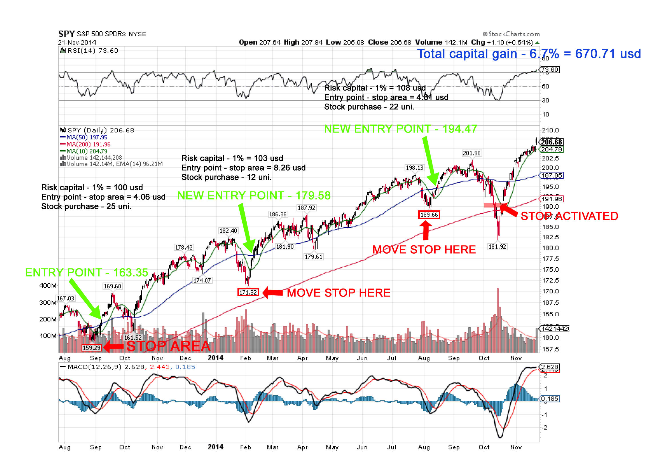 My money management was really simple I would pick a stock that would meet my predefined attributes. Then I would identified a low point near 50 day moving average or some new higher low on the uptrend movement. Here I would define my stop area and I would tried to buy the nearest I could from this point. The difference between my entry and stop point would be the equivalent of 1 to 3% of my total capital. This was the amount of money that I decided that I could loose in a single trade. This implied that I would have little space for error because I would stop trading If my losts achieved 10% of my total capital.